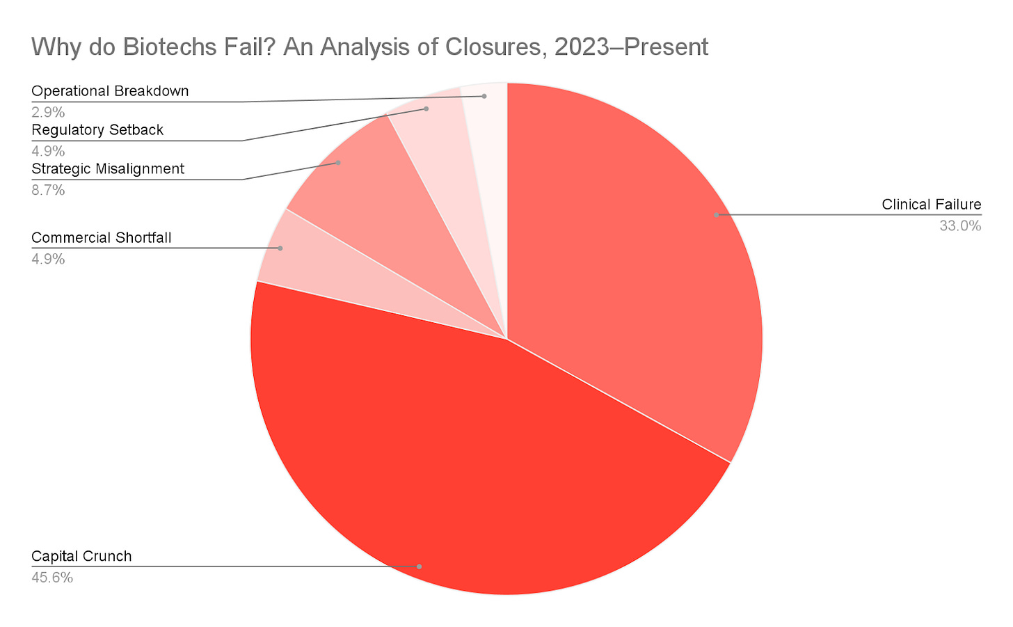 While clinical trial failures accounted for approximately one-third of public explanations for recent biotech closures, capital crunch remained the most significant factor, underscoring that financing risk, not science alone, is the dominant existential threat. A subgroup analysis revealed that of companies for whom capital crunch was a primary cause of failure, lack of investor confidence accounted for nearly three-fourths (72.5%) of cases, whereas excessive burn rate (19.6%) and macroeconomic landscape (7.8%) made up the minority. However, these three players are often interrelated, and thus cannot be considered in isolation—rapid cash burn can erode investor confidence, just as a poor funding climate can magnify the effects of either; thus, this subjective analysis cannot be taken for a definitive causal hierarchy of risk, but rather as a directional snapshot of publicly visible patterns.