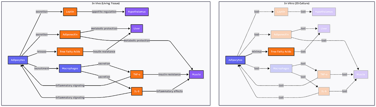 Age-related metabolic diseases may occupy a different territory. Visceral adipose tissue secretes leptin that regulates hypothalamic appetite circuits, releases free fatty acids that drive hepatic insulin resistance, recruits macrophages that sustain inflammatory signaling through TNF-α and IL-6, and responds to sympathetic innervation controlling lipolysis. An adipocyte on plastic loses mechanical tension from extracellular matrix, paracrine signals from neighboring pre-adipocytes and immune cells, endocrine inputs from distant organs, and vascular perfusion delivering nutrients and immune factors. Whether these features are signal (revealing therapeutic targets invisible in reductionist systems) or noise (obscuring molecular mechanisms) determines which experimental platform can distinguish causal drivers from the vastly larger set of genes that correlate with disease readouts in simplified models but prove irrelevant in human pathophysiology.
