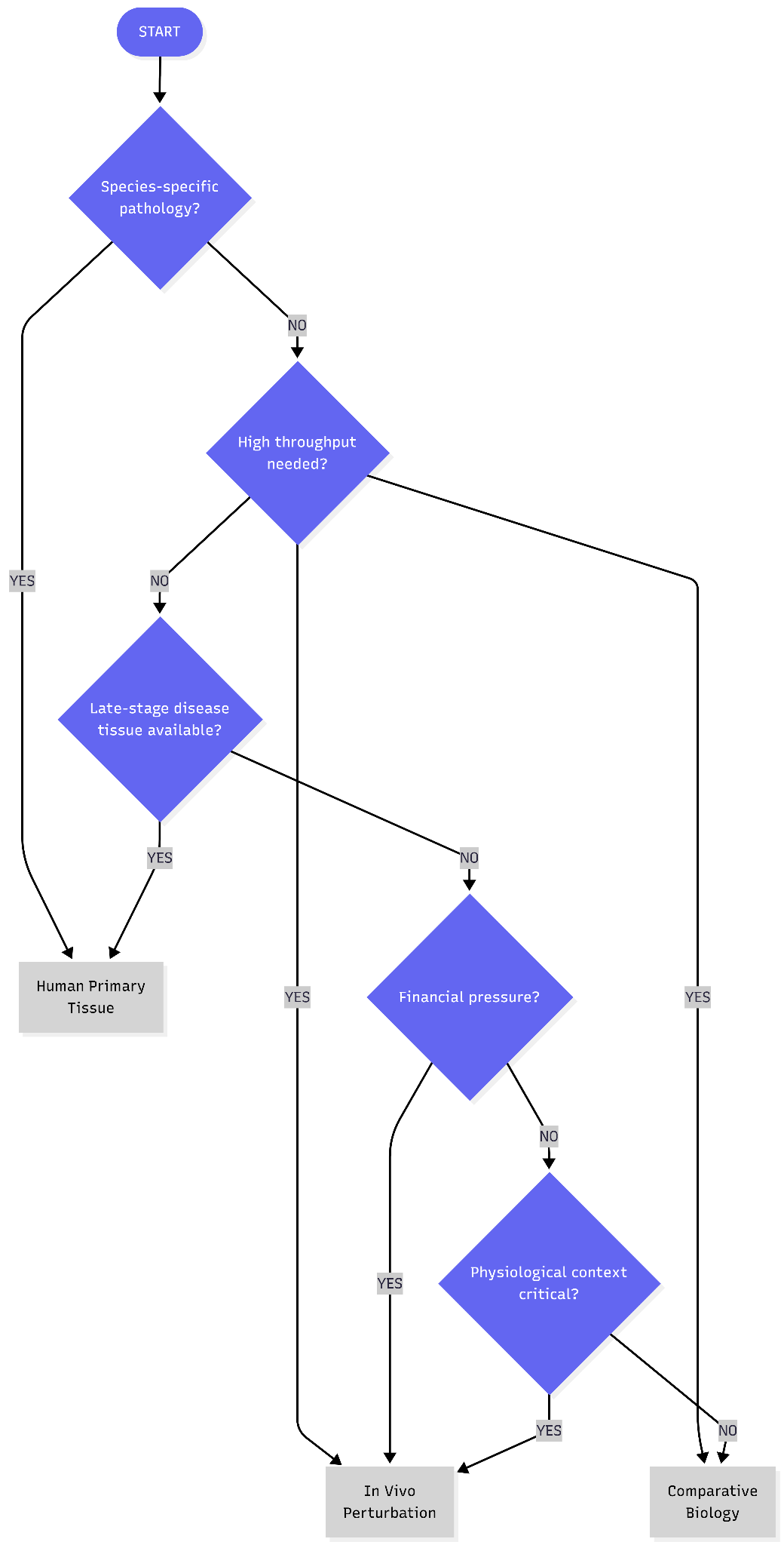 The platform choice reveals a testable hypothesis about chronic, age-related disease target identification: that physiological context is a NEED. Traditional 2D adipocyte cultures fail to recapitulate the insulin resistance phenotype central to metabolic disease; co-culture with macrophages in 3D systems is required to observe reduced glucose uptake and impaired GLUT4 translocation characteristic of inflamed adipose tissue. More fundamentally, in vitro systems, even sophisticated vascularized 3D adipose tissue models cannot fully replicate the in vivo environment as the constitutive elements (hormones, cytokines) exist at fixed concentrations rather than the dynamic, responsive levels found in living tissue.